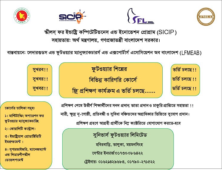 সুখবর… সুখবর….ফুটওয়্যার শিল্পে বিনামূল্যে কারিগরি প্রশিক্ষণ: ভাতা ও চাকরির নিশ্চয়তা সহ ভর্তির সুযোগ।